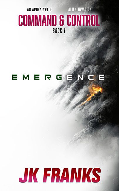 And then comes the typography, and oh, what a hot mess it is. At the top we get “COMMAND & CONTROL” in bright magenta all caps, which looks like it was borrowed from an old VHS action flick starring Jean-Claude Van Damme. The title, “EMERGENCE,” is in sterile green, probably lifted straight from a free sci-fi font pack circa 2005. They don’t even attempt to match. And finally, the author’s name. JK FRANKS. In giant red block letters so loud, so bold, that it drowns out everything else. Forget the end of the world — the real emergency here is the typography.